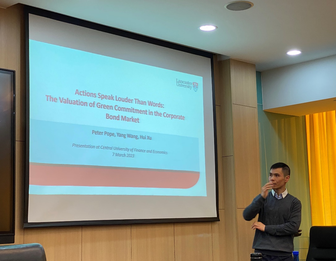 2023年3月7日上午,威廉希尔中文官网在学术会堂604会议室举办了学术论坛,邀请英国兰卡斯特大学汪洋助理教授报告了其合作团队近期的一项研究成果“Actions Speak Louder Than Words: The Valuation of Green Commitment in the Corporate Bond Market”。汪洋博士于2019年毕业于英国伦敦政治经济公司(LSE)会计学专业,主要研究领域包括企业债券市场、ESG披露、卖方分析师行为等。本次论坛由威廉希尔中文官网王木之助理教授主持。