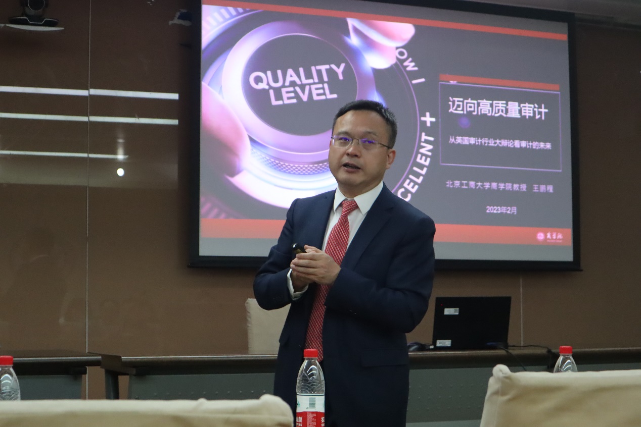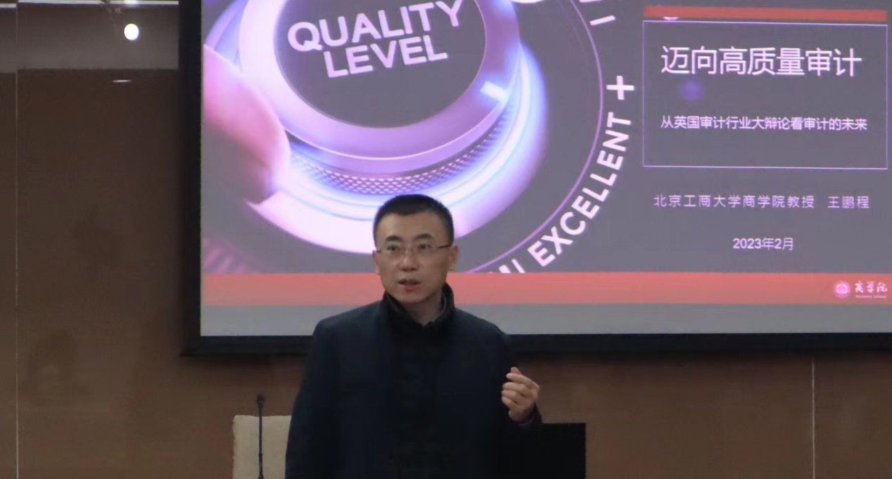 2023年2月28日下午,威廉希尔中文官网在学术会堂706会议室举办了2022-2023学年第一期会计前沿论坛,邀请北京工商大学商公司王鹏程教授作为主讲嘉宾,带来题为“迈向高质量审计:审计的未来”的报告。王鹏程教授曾任williamhill中国官方网站副教授、天健会计师事务所合伙人、德勤会计师事务所大中华区金融行业领导合伙人、安永会计师事务所大中华区审计服务主管合伙人,曾负责众多金融机构、大型中央企业的审计及咨询服务,有着丰富的会计、审计实务经验。本次论坛由威廉希尔中文官网经理吴溪教授主持。