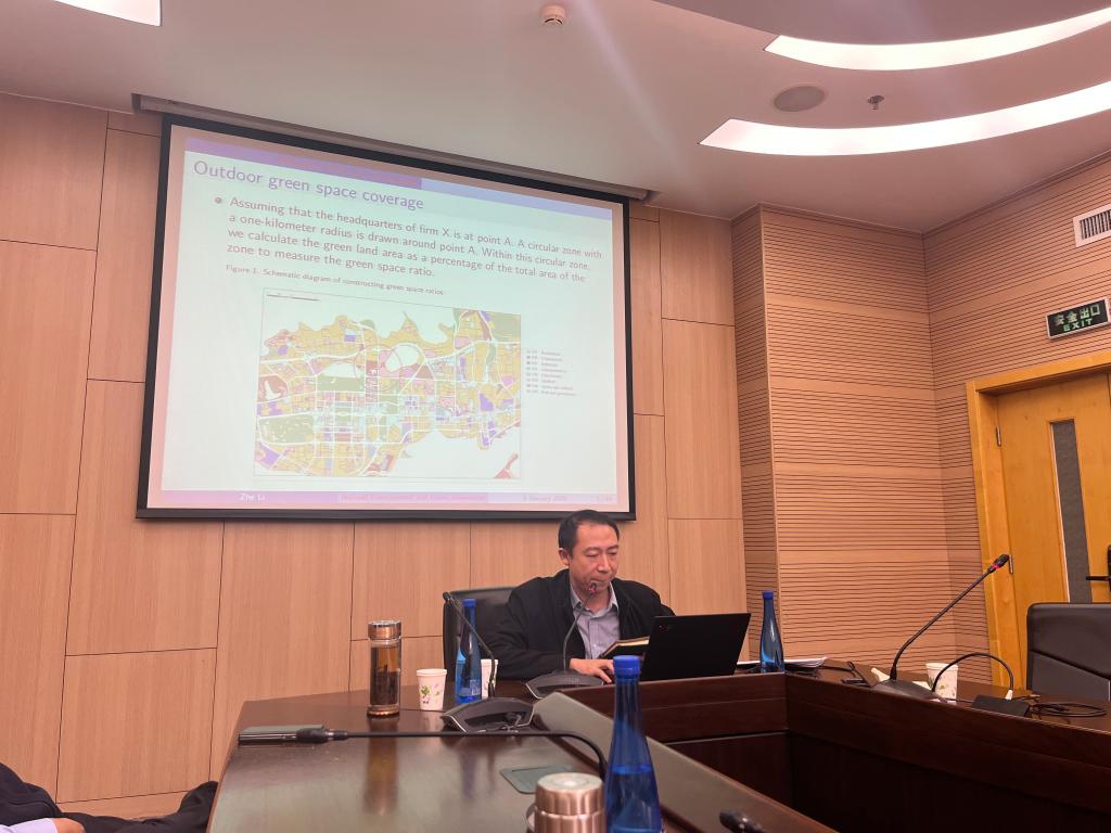 李哲副教授及其合作者利用一项中国户外绿地覆盖的独特数据,发现企业总部和分支机构周围绿地覆盖面积对企业的绿色创新有促进作用,其中的机制在于户外绿地覆盖率高的企业更有可能任命具有环境专长的CEO和董事会成员,在信息披露时更关注创新。这些研究发现强调了工作环境在促进企业创新方面的战略重要性。在论坛讨论环节,与会师生与李哲副教授就理论分析、研究设计、内生性问题的解决等方面展开了热烈讨论。