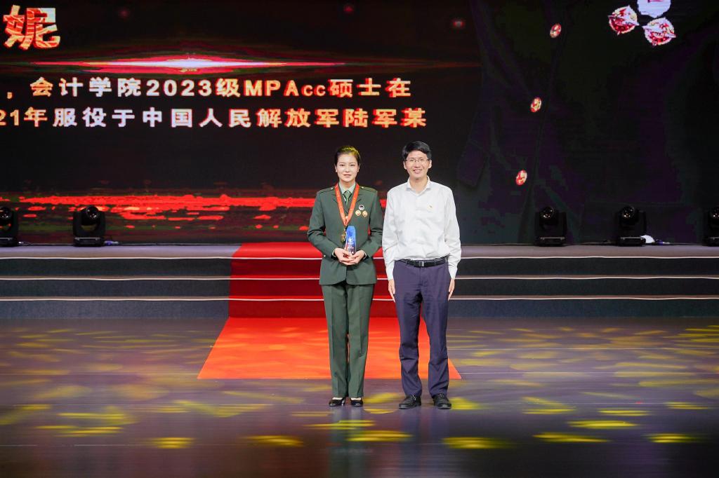 2023年9月12日,在公司第二届“感动中财人物”颁奖典礼的舞台上,一个身着军装、英姿挺拔的熟悉身影映入大家的眼帘,她就是公司2023级MPAccF1班同学周晓妮,可能很多人对她并不陌生,因为在2022年度“榜样中财人物”的颁奖典礼上她已经给广大师生留下了深刻的印象,此次获评“感动中财人物”,再次展现出新时代退役老员工士兵能文能武、追求卓越的奋斗姿态!