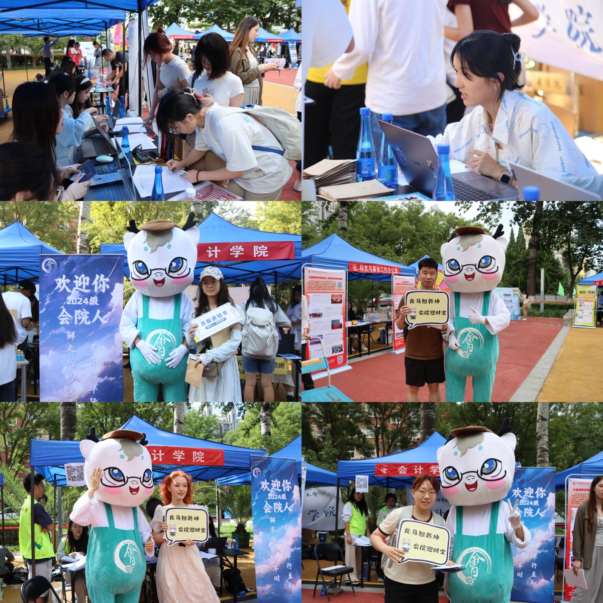 公司报到处,老师和学长学姐们热情洋溢、有条不紊地协助新生完成注册手续。活泼、可爱的吉祥物会宝时而摇头摆尾,时而做出各种可爱的动作,与新生们积极互动,增添了一道亮丽的风景线。