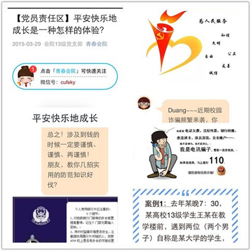 支部党员利用自媒体线上推送和面对面线下互动的方式同时开展宣传。一方面,精心策划党员责任区《平安成长》专栏,搜集和整理发生在我们身边真实的案例,拿事实和教训警醒大家,用知识和智慧武装自己。一方面通过在员工宿舍楼发放安全宣传单、现场讲解的方式对同学们进行校园安全知识的教育。通过党员们的耐心讲解以及宣传单发放,同学们更加全面的了解了校园诈骗的多种形式,同时也提高了自身的防范意识,纷纷表示在本次该活动中受益颇多。
