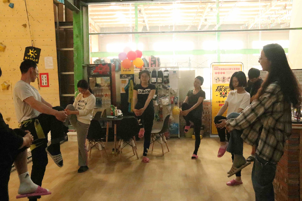 接着大家换上了攀岩装备,在教练的带领下做热身运动,拉伸肌肉,防止稍后的剧烈运动造成身体不适。