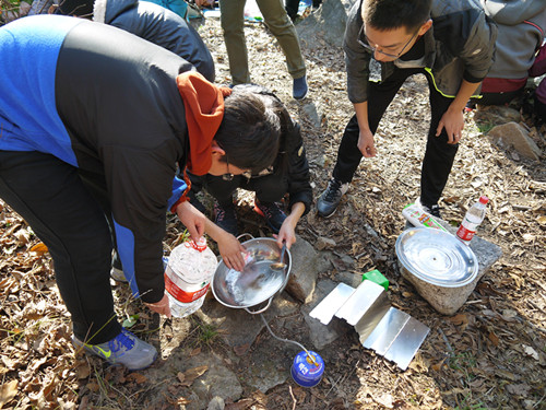 经过一个多小时的行程,各队陆续抵达了位于半山腰的野炊空地,开始了自助野炊。同学们在老师的带领下,热火朝天,干劲十足。没有盐,没有油,我们自己造;没有姜,没有蒜,榨菜用的妙;火不足,气不够,手动使劲摇;面清淡,菜清淡,鸡骨做汤料。回想到当年红军爬雪山、过草地、吃草根、啃树皮的艰苦情形,同学们一边“嫌弃”着自己的“黑暗料理”,一边吃的狼吞虎咽,风卷残云。