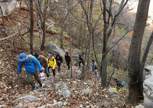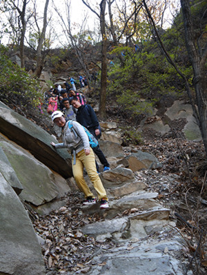午饭过后,师生们继续徒步攀爬之旅。天池峡谷林荫树茂,岭奇路险,台阶上落叶密布,多处湿滑。大家手脚并用,互帮互助,发挥不怕苦不怕累坚持到底的红军精神,攻克了一处又一处险地。