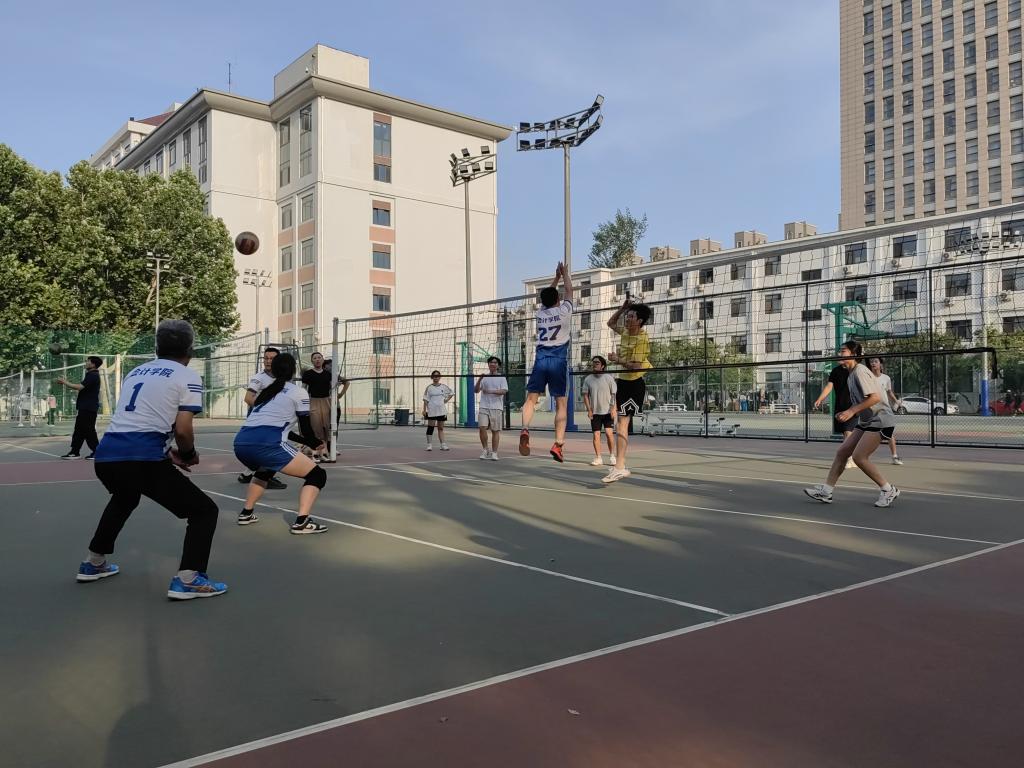 篮球场上,老师和同学们以交叉组队方式采取每场21分制进行比赛,快攻、抢断、突破、跳投……,双方你来我往,比分交替上升,他们以流畅的配合与娴熟的技术为大家带来了一场精彩纷呈的比赛。排球场上,老师和同学们分别组队打满三局比赛,双方在比赛中你追我赶,多次上演精彩的扣球和网前拦防,他们的精彩表现不时引起场下观众的掌声与欢呼。