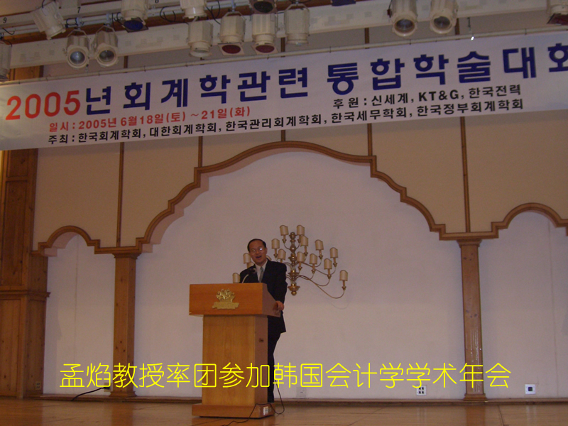 应韩国会计学会的邀请,以威廉希尔中文官网经理孟焰教授为团长的中国会计教授会(现中国会计学会教育分会)代表团一行8人,参加了6月20至21日在韩国著名的滑雪渡假圣地Muju 举行的韩国会计学会(KAA)2005年学术年会。参会期间,代表团受到了韩国会计学会年会组委会的接待,与韩国会计学会的现任会长、前任会长、后任会长等韩国会计界著名教授进行了交流,孟焰教授在年会开幕式上致辞。中国会计教授会代表团成员来自我国5所大学,分别是williamhill中国官方网站的孟焰教授和杨金观教授、西南财经大学的彭韶兵教授和林万祥教授、上海交通大学的张天西教授、西安交通大学的张晓岚教授、南开大学的刘志远教授和东北财经大学的崔顺姬教授。