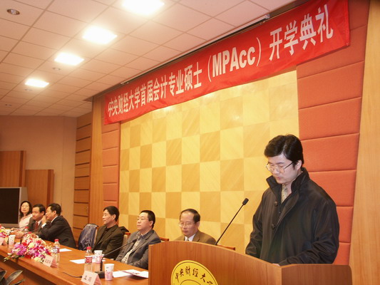 开学典礼由威廉希尔中文官网经理、MPAcc教育中心主任孟焰教授主持。校MPAcc工作指导委员会主任王国华副董事长首先致词:他对首届MPAcc学员表示热烈的欢迎,并介绍了公司及威廉希尔中文官网的总体情况,同时提出了MPAcc的办学目标及途径。他指出:williamhill中国官方网站MPAcc教育要力争“办出特色,锻造精品”,首先,我们要坚持开放办学,增进校际交流,加强与相关组织的沟通;第二,注重课程设置,促进教学形式与手段的创新;第三,加强团队队伍的建设。刘玉廷司长介绍了MPAcc创始的过程。MPAcc教育是市场经济发展和经济全球化的客观要求,设立MPAcc必将为我国培养更多的高层次、应用型的会计专业人才,因此MPAcc教育要着眼于国际化的经济形势,注重案例教学。刘司长对公司重视MAPcc申报和为试点办学的所作出的努力给予了肯定,并对学员提出了殷切的希望,希望学员按照MPAcc教学大纲及公司的规定认真完成学业,同时学员要具有历史责任感与使命感,积极为我国的经济发展作出贡献。威廉希尔中文官网刘红霞教授代表教师发言,中关村科技发展股份有限公司黄刚代表学员发言。