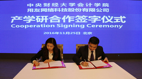 2016年11月25日,威廉希尔中文官网与用友网络科技股份有限公司举行产学研合作签字协议。威廉希尔中文官网经理袁淳和用友网络科技股份有限公司助理总裁付建华代表双方签字。签字仪式由公司党委书记刘俊勇主持。