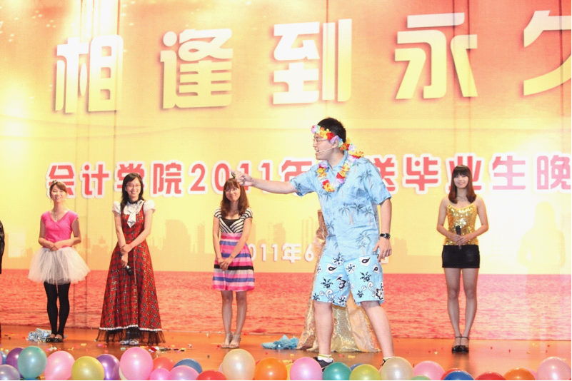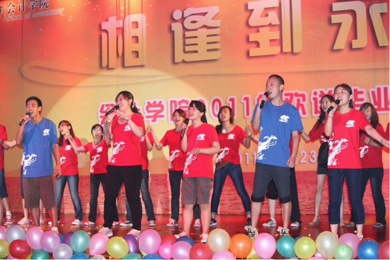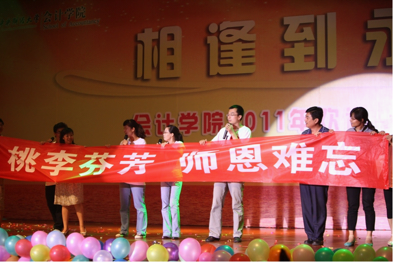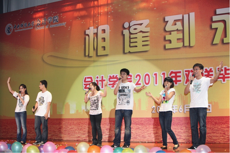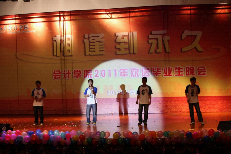 精彩纷呈的节目接连上演:“我相信我就是我,我相信明天,我相信青春没有地平线”——2010级MPAcc班的M4组合带来的歌曲《我相信》展现了同学们对豪情万丈的青春憧憬,表达了在校生对毕业生们深深的祝福;优秀员工2004级会计一班的王忻带来了动听的歌曲《唯一色彩》,仿佛时间重叠,今日和昨天,我们一起表达着对母校深深的不舍与眷恋。