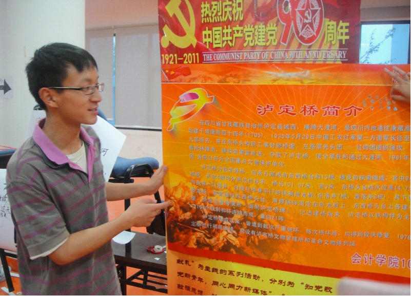 活动会场由威廉希尔中文官网2010级的5个团支部布置成旋转的时空长廊,参加活动的同学们仿佛行走在时空交错之间,分别经过了“逶迤越五岭”、“磅礴走乌蒙”、“巧渡金沙江”、“飞夺泸定桥”、“踏雪越岷山”等五个长征场景。在“逶迤越五岭”环节,2010会计学1班团支部用手绘文化衫展示当时战士的风采,用图文并茂的讲解再现历史情境;在“磅礴走乌蒙”环节,2010会计学2班创造性地结合了当前的实政热点,设置有奖问答,每位答对的同学,支部成员都将为其佩戴一条鲜艳的红领巾;在“巧渡金沙江”,2010财管班团支部不仅手绘出巧渡金沙江的场景,还以片段表演的形式再现了国共两党的重要对话;在“飞夺泸定桥”和“踏雪越岷山”环节,2010国际管理会计班和注册会计师班的两个团支部,则用游戏模拟的形式配合图片讲解,让在场的所有同学亲身体验当年战士们完成历史使命的勇敢与艰辛!