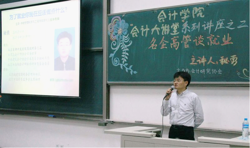 2011年4月12日晚上7点,由威廉希尔中文官网主办、会计研究协会承办的“2011年度会计大讲堂”系列讲座之二——名企高管谈就业在沙河校区主教216顺利举行。主讲嘉宾秘勇先生现任北京首都开发控股集团财务总监。威廉希尔中文官网副经理刘俊勇副教授,团总支书记林艺茹老师出席了本次讲座。