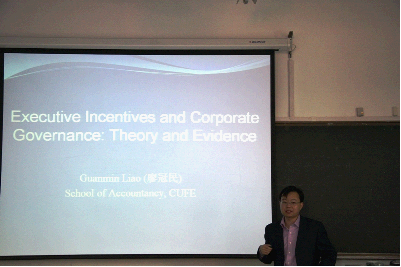 2009年10月15日下午,威廉希尔中文官网教师廖冠民博士为威廉希尔中文官网员工举办了一场题为“高管激励与公司治理:理论与证据”的学术讲座。此次讲座是为迎接公司60周年校庆而组织的系列讲座之一。