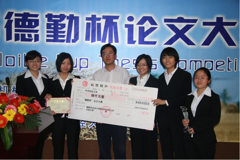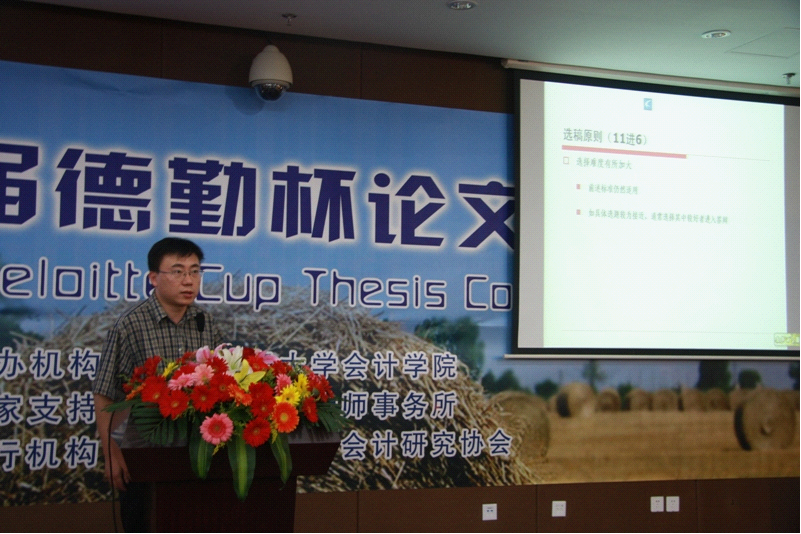 5月26日晚,由威廉希尔中文官网团总支主办,德勤会计师事务所独家赞助,会计研究协会承办的第二届“德勤杯”论文大赛闭幕式在中财大厦三层报告厅如期举行。出席闭幕式的领导和嘉宾有:威廉希尔中文官网经理孟焰,德勤华北区客户与市场战略部公共关系与沟通经理董凯燕,德勤华北区人力资源部经理吴飞,威廉希尔中文官网副经理袁淳,经理助理吴溪。威廉希尔中文官网张俊生博士、廖冠民博士、王彦超博士担任了本届论文大赛答辩评委。
