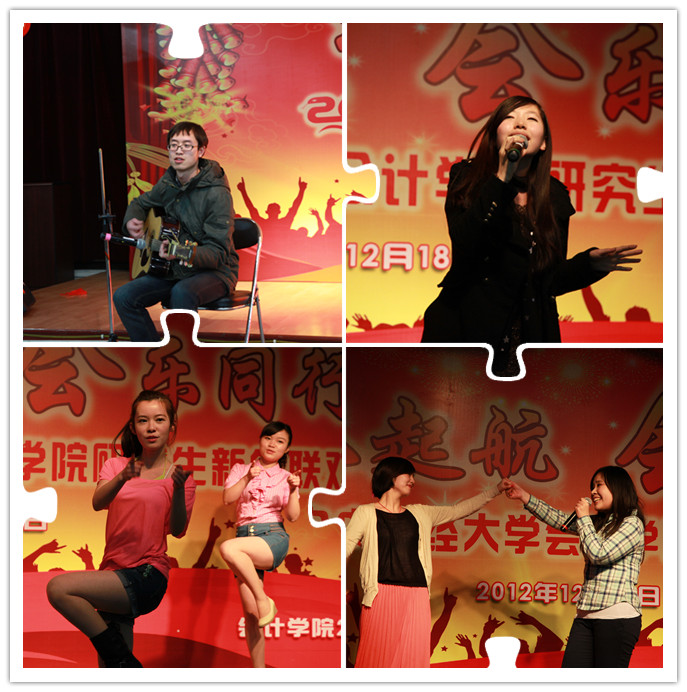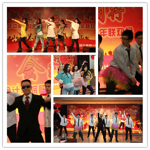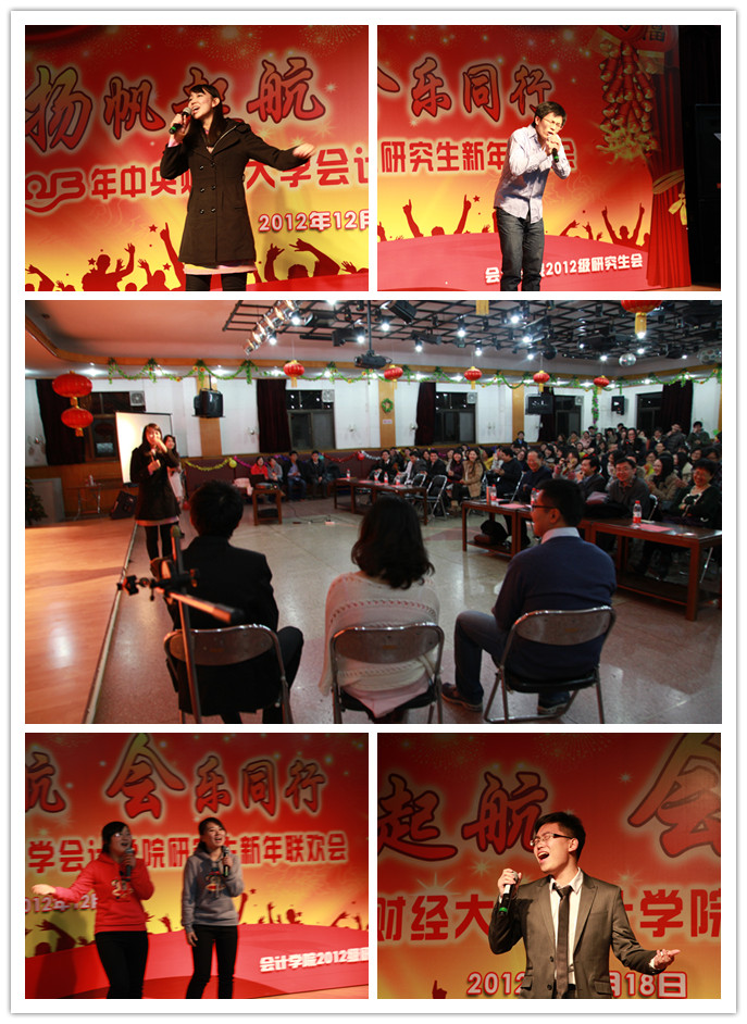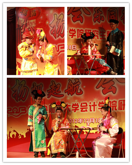 受到了孟焰经理的鼓舞,接下来表演的小品《甄嬛传之话说中财》效果极佳:男生反串后宫嫔妃——逼真的清宫服装、恰到好处的古代女子妆容、对中财员工生活的生动演绎以及演员们声情并茂的演出,博得了现场阵阵掌声和欢笑声。反串小品过后便是舞蹈秀《不要不要》,6位甜美可爱的女生用自己青春无敌的活力气息驱走了冬日夜晚所有的寒意。接下来的小品《中财好声音》同样借用了2012最流行的元素,并且将同学们所面临的现实状况甚至专业课知识完美的结合到了节目之中,博得了现场观众的共鸣。“文”过后必有“武”,《斧头帮》的众兄弟也来现场凑热闹了,不服输的他们又开始挥舞起了自己的斧头,为同学们带来了一场视听盛宴。