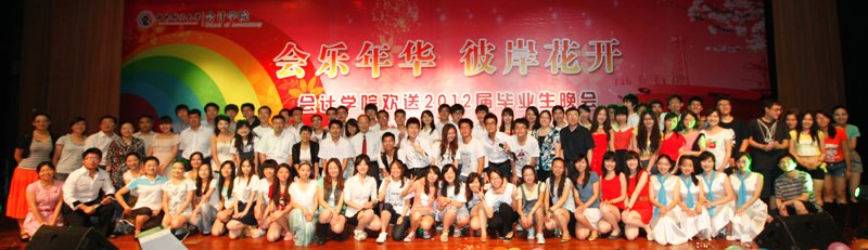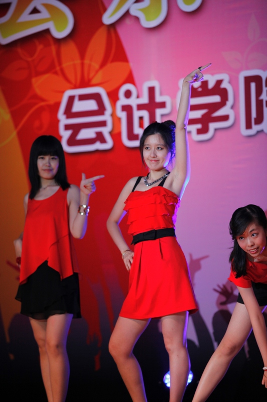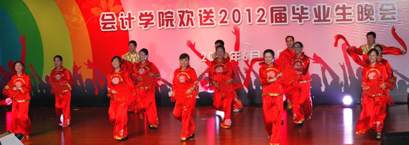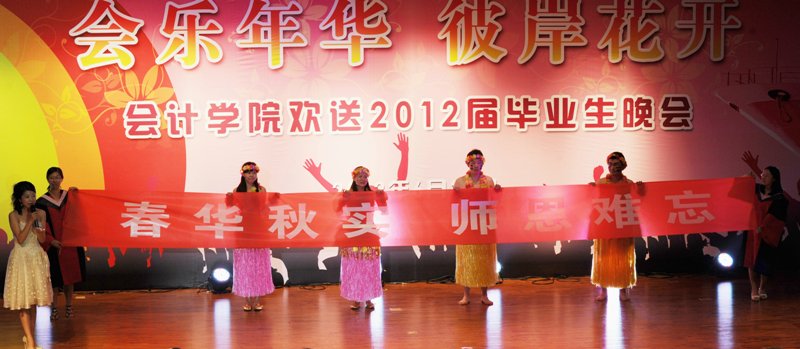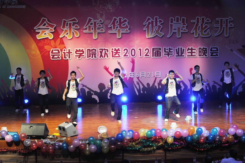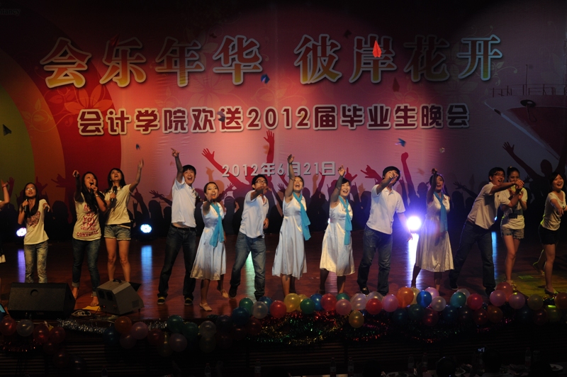 歌曲联唱环节,曾获得校园十佳歌手荣誉称号的他们用清扬的歌声唱出了毕业生对母校的留恋与不舍、唱出了对四年老员工活点滴的无尽回忆、唱出了对未来的美好期盼。2010级会计普硕班的帅哥们倾情表演了属于自编自导的搞笑舞蹈《最炫民族风》。2008级本科生带来爵士舞《Let Me》热情奔放、激情四射。由2008级本科会计2班带来的校园短剧《大学那些事》重现了08级本科生从上庄到沙河再到公司南路校区的种种学习生活场面,把观众带回到青涩的大一、快乐的大二、忙碌的大三、成熟的大四,这犹如成长的一个个脚印坚实地踏在观众的心里。08财管班同学们带来的歌舞《你在烦恼什么》述说了烦恼总是让大家纠结郁闷,却也让平稳的生活有了不一样的精彩。