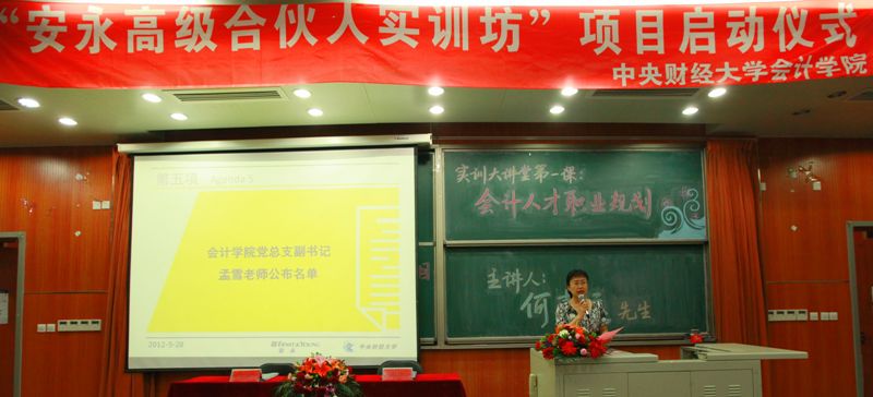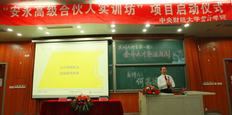 2012年5月28日晚,威廉希尔中文官网“安永高级合伙人实训坊”启动仪式暨第一讲“会计人才职业规划”在沙河公司3号楼222室隆重举行。安永大中华区审计服务首席合伙人何嘉远先生、安永大中华区人力资源部合伙人黄文先生、安永(中国)人力资源部经理罗燕春女士、安永(中国)人力资源部王谦女士、威廉希尔中文官网经理孟焰教授、williamhill中国官方网站校团委书记高杰老师、公司党总支副书记孟雪老师出席了启动仪式。大会由威廉希尔中文官网团总支书记林艺茹老师主持。