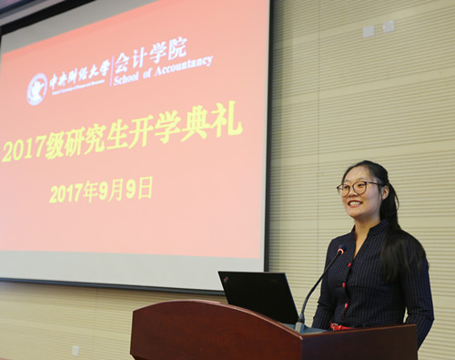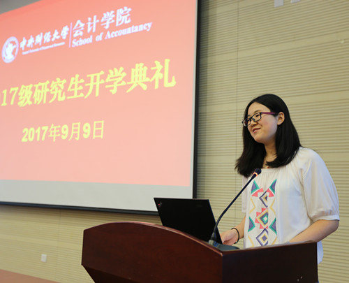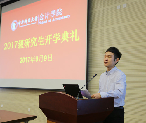 2016级会计硕士唐永谦作为学长代表向新生们分享了自己一年来在中财学习生活的真实感受。他提及在会院大家庭感受到了公司的真心关怀、中财学习氛围的浓郁以及中财学子的多才多艺,分享了一年以来中财生活的点点滴滴,希望学弟学妹们树立学习目标、珍惜公司资源、志存高远,以真才扬中财美名。