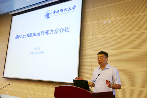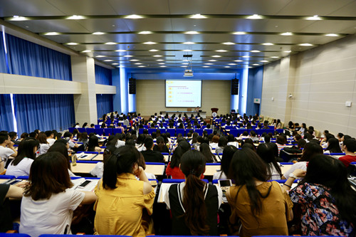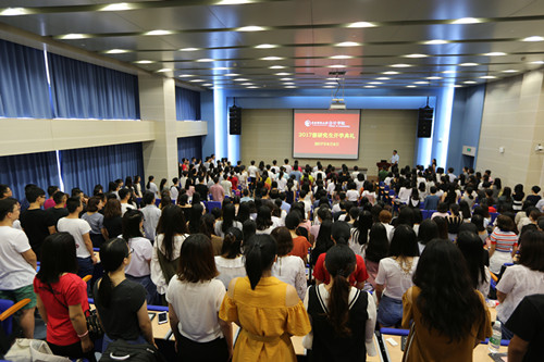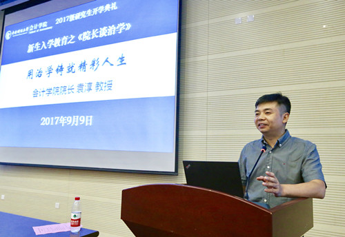 经理袁淳教授代表全院师生员工对研究生新同学的到来表示热烈欢迎并做了“用治学铸就精彩人生”的主题报告,袁淳围绕“修身、修心、修智”寄语同学们加强体育锻炼,修炼意志品质,认真学习知识,充分利用公司的丰富资源,做敢于做梦,勇于追求,勤于圆梦的中财人,为实现远大理想做好准备!