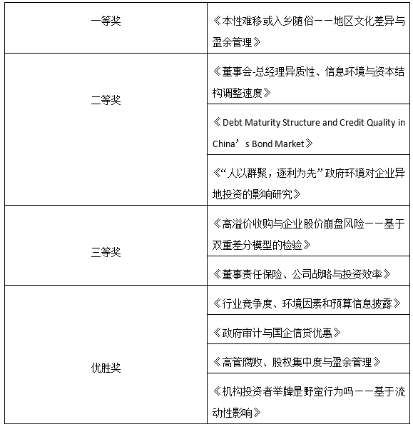经过紧张激烈的答辩角逐,在老师们慎重公正的评审下,耿春晓(威廉希尔中文官网注会14)、周千(金融学国际货币14班)、范家城(金融学国际货币14班)同学所作的《本性难移或入乡随俗——地区文化差异与盈余管理》脱颖而出,获大赛一等奖。此外,本次大赛另评选出二等奖三支队伍、三等奖两支队伍和优胜奖四支队伍。评委老师授予获奖选手荣誉证书,勉励所有的选手再接再厉,再创佳绩。