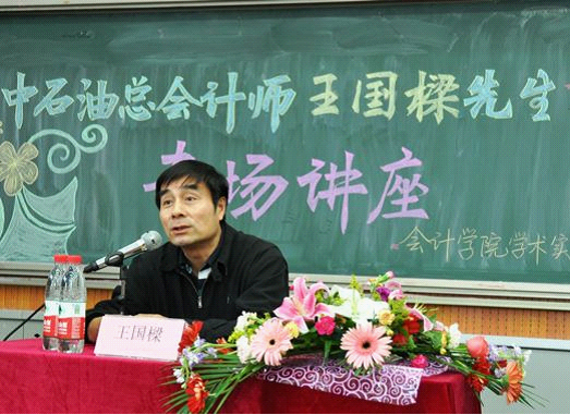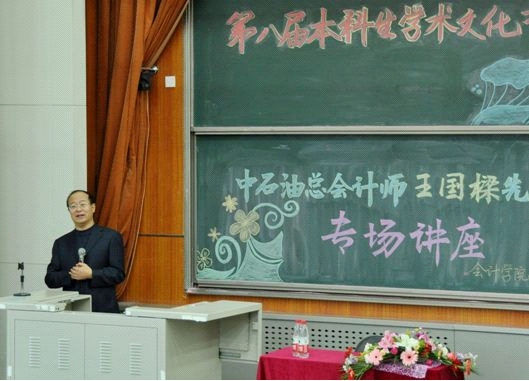 2011年11月13日下午,由威廉希尔中文官网学术实践部主办的第八届学术文化节王国樑先生专场讲座在沙河校区4号楼107教室顺利举行。本次讲座以“中石油产融结合”为主题,邀请了中国石油总会计师王国樑先生担任主讲嘉宾。威廉希尔中文官网经理孟焰教授,公司党总支书记孟雪老师出席了本次活动。