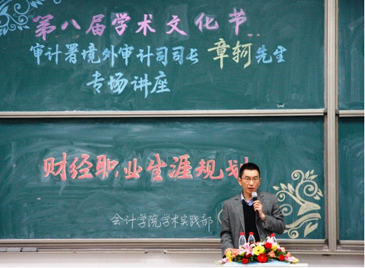 随后,ACCA资深会员,国家审计署境外审计司司长章轲先生以他丰富的人生阅历和工作经验,与同学们探讨他对“财经职业规划”的看法。章司长认为老员工离开校园的同时也就开始了被淘汰的过程,因此要想在残酷的竞争中取得成功,在大学时就必须做到以下几点:第一,多学多读,只有博览群书才能挖掘出思想深度。第二,多思考,在生活小事中训练思维能力,开拓思路,逐步学会运用正确的逻辑方法合理拆分想要表达的内容;在看待问题时不仅要思考其是什么,还要知道为什么。第三,重视团队合作及leadership,每个人都会在人生中遇到各种挫折,这时就需要依靠你的组织技巧,全方位运用良好的管理与沟通能力解决困难。最后章司长提出:进入大学并不等于进入保险箱,如果你不比别人聪明十倍,你就要比别人多付出十倍的努力。
