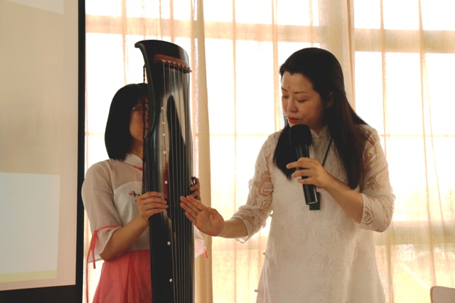 在接下来的讲座中,杨璐萌女士用一首琴曲《良宵引》引出开篇,原本盛夏里的纷扰燥热在此番悦耳琴音中顿然化为全场静谧。此后,杨璐萌女士从古琴的来源讲起,类比各种传统乐器的前世今生、本土化历程,彰显古琴的悠久历史,1200年未发生变化,“窈窕淑女,琴瑟友之”的诗句间尽显其深厚吸引力和蓬勃生命力。此后,杨老师以现场展示的方式,用通俗易懂的语言解读琴体构造,一番对古琴的实景描述拉近了学员们与古琴间的距离,让学员们对于古琴有了更多的了解。