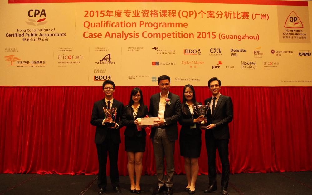 2015年12月6日,由香港会计师公会主办、享有“会计学界比赛的奥斯卡”美誉的“2015年度专业资格课程(QP)”个案分析比赛在广州落下帷幕。经过长达半年的“八页摘要”初选、完整报告复审的层层角逐,来自williamhill中国官方网站、上海财经大学、北京师范大学-香港浸会大学联合国际公司(简称UIC)、南开大学、江西财经大学、首都经济贸易大学等八支代表队进入了决赛。由威廉希尔中文官网注会13的蔡懋璇(队长)、杨伊晨和国际经济与贸易公司中澳13-1的刘傲、吴晓宇等4人组成的代表队最终摘得桂冠,其中吴晓宇同学获得了“最佳演讲者”称号。