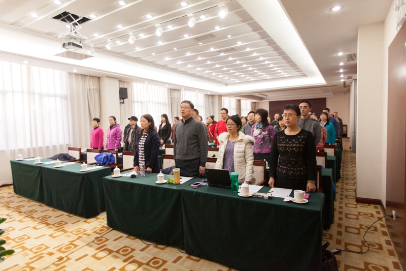 首先,袁淳老师宣布大会开始,全体参会人员起立奏唱《国歌》。