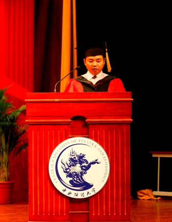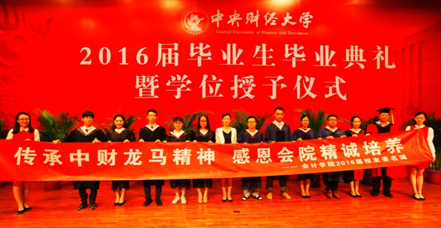 2016届毕业生代表,来自2013级会计博士班的安吉娃、2014级MPAcc-F班的冯雨筱、2014级MPAcc-P班的李爱静以及2012级财务管理班的李昕代表全体威廉希尔中文官网毕业生上台发表毕业感言。他们以真挚的情感回忆了老员工活的点点滴滴,以真情的话语道出了对师长和亲朋的感激与留恋,以昂扬的斗志表达了用实际行动做好中财会院人,共同创造中财会院美好明天的决心。