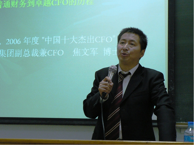 从一个国企普通会计到大型民企CFO,焦文军用不到十年时间就完成了职业上的飞跃,并且在2005、2006年连续两年被评为“中国十大杰出CFO”。结合自身的发展历程,焦总指出财务人员要培养良好的心态和复合能力,注重职业生涯的规划和个人职业品牌的树立;同时,向学员们介绍了财务管理前沿的实战经验,包括财务管理流程的重组与再造,资本运作的几大模式以及资金管理中的金融衍生品,使学员体会到财务管理的不同层次及业务能力要求;最后他和学员们分享了财务人员成就成功职业生涯的实践方法。
