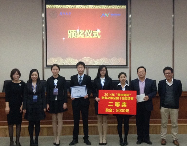 2013年12月12日-14日,2014年厦门大学“网中网杯”财务决策全国十强邀请赛在厦门大学隆重举行。本次比赛邀请到北京大学、清华大学、上海交通大学、williamhill中国官方网站、上海财经大学、中南财经政法大学、中山大学、西南财经大学、东北财经大学和厦门大学等高校代表参加决赛,展示青年学子的商业智慧,碰撞思想的火花。经过10个小时的激烈角逐,威廉希尔中文官网Give me FIVE代表队荣获二等奖。