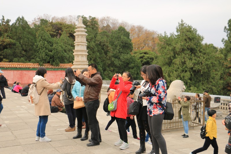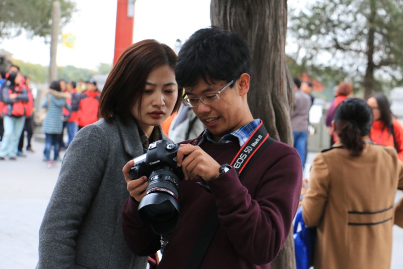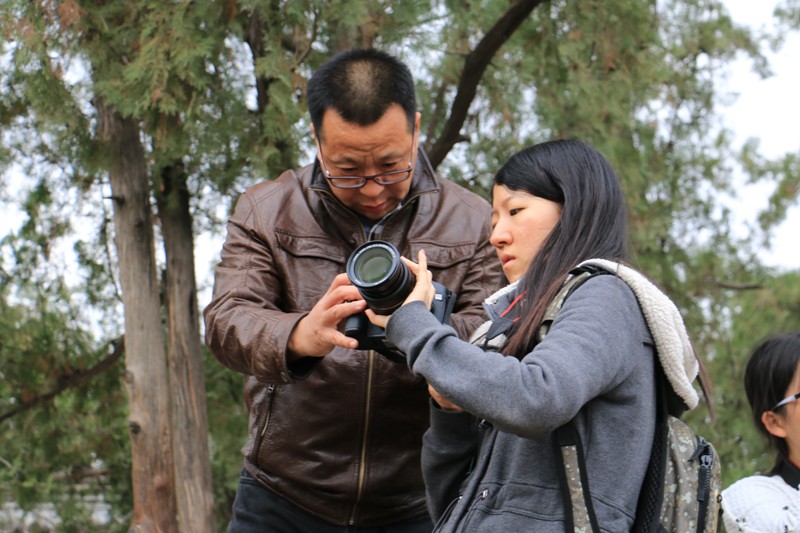 下午2点,老师和学员在天宫门会合。进入颐和园,陈老师先向学员介绍了拍摄路线和颐和园经典的拍摄景点,然后带领大家开始游览。第一个停驻地点是苏州街,学员们分别用M门、AV、TV等不同档拍摄,揣摩光圈、快门和感光度对成相的影响,陈老师在一旁不时的悉心指导,传授经验。暂离苏州街,大家继续前行,寻找下一处美景。正走着,一阵风吹过,金黄色的枫叶纷纷飘落在绿坪上,仿佛一幅对比鲜亮的老油画,老师和学员们不约而同地或举起相机或拿着手机疯狂抓拍。风停之后,安钊同学提议大家来一张落叶纷飞的场景,得到一致赞同。 “三…二…一!”,“哗”的一声落叶漫天飞舞,伴着大家阵阵爽朗的笑声,老师和学员们都留下了美好的回忆。