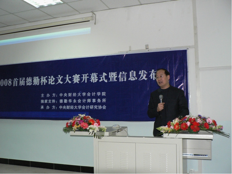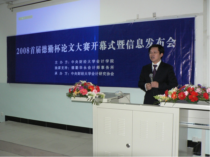 2008年首届“德勤杯”会计论文大赛开幕式暨信息发布会于2008年3月31日晚7:00在主教楼206隆重召开。出席开幕式的领导和嘉宾有:威廉希尔中文官网经理孟焰、德勤北京分所主管合伙人陈建明先生、威廉希尔中文官网副经理袁淳、德勤北京市场与客户战略部高级经理姜可梅女士、德勤北京人力资源总监孙冰女士、威廉希尔中文官网廖冠民博士、威廉希尔中文官网团总支王伟。一百五十多名中财员工以及来自清华、北大、人大、对外经贸、首经贸、北师大、北理工、北语言等八所高校的员工代表参加了开幕式。
