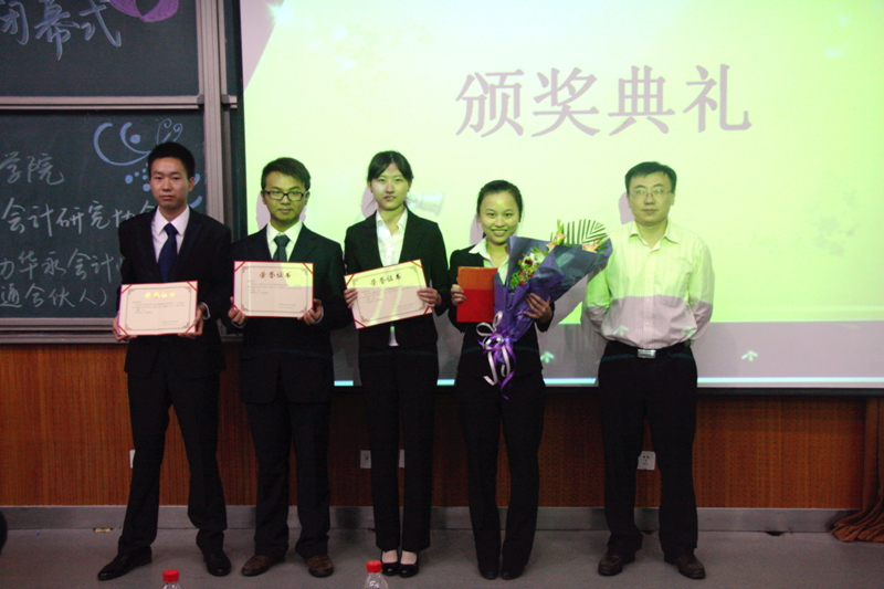 最后六位评委综合考量了各组论文质量和答辩表现后各自进行排名,并据此平均来确定各支队伍的最终排名。最终产生了一等奖一组,二等奖一组,三等奖一组。金恺、李涵益、周舒、夏旭琪同学的论文《媒体关注下的声誉机制能发挥作用吗?——以华谊兄弟并购浙江常升为例》获得一等奖。