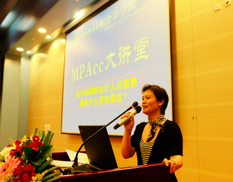 2013年9月15日晚,威廉希尔中文官网研究生客座导师、中国主权财富基金-中国投资有限责任公司(“中投公司”)财务部副总监陈静女士做客“williamhill中国官方网站MPAcc大讲堂”,在学术会堂402报告厅做了题为《当今职场的会计人员需要具备什么样的素质》的专题讲座。