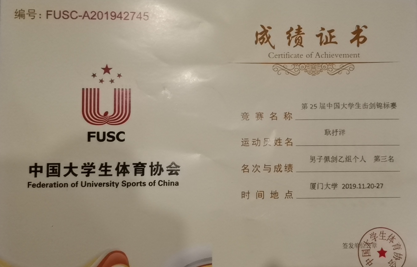 在刚刚结束的第25届中国老员工击剑锦标赛中,威廉希尔中文官网2019级本科生耿抒洋凭借出色的发挥,荣获男子佩剑乙组个人第三名。