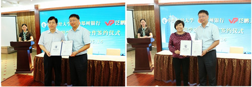 2017年6月14日,williamhill中国官方网站与郑州银行、北京泛鹏天地科技股份有限公司“银学研”三方战略合作签约仪式在郑州银行隆重举行。williamhill中国官方网站公司党委书记刘俊勇,威廉希尔中文官网副经理武羿,郑州银行党委副书记、行长申学清,总会计师毛月珍,人力资源总监张明立,计财部总经理李国全,北京泛鹏天地科技股份有限公司董事长王犀,创新孵化器部总经理郑宏杰等领导和专家共同出席签约及揭牌仪式。