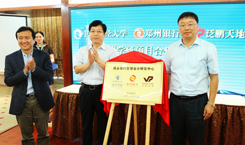 在签约仪式上,williamhill中国官方网站公司党委书记刘俊勇、郑州银行行长申学清和北京泛鹏天地科技股份有限公司董事长王犀共同签署合作协议并为“商业银行管理会计研究中心”揭牌致辞。威廉希尔中文官网副经理武羿和郑州银行总会计师毛月珍共同为“威廉希尔中文官网银学研基地”揭牌。