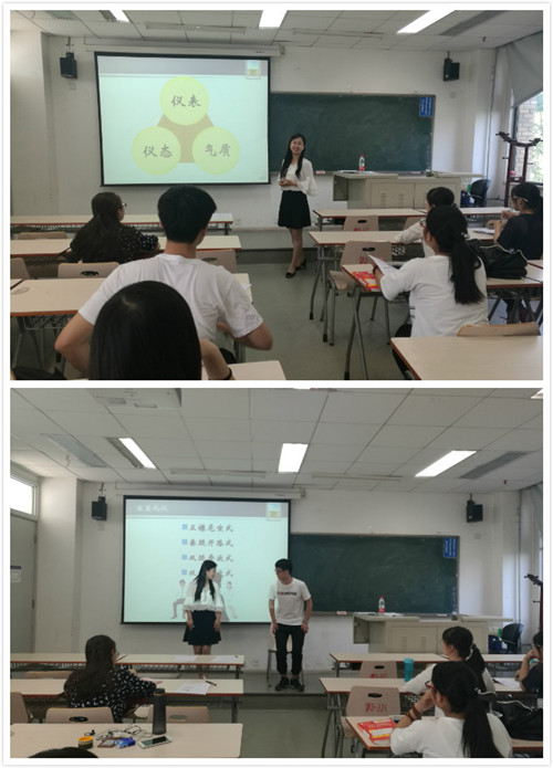 5月17日下午、5月18日晚上,由刘琳琳老师向同学们讲授第二模块“不学礼,无以立——老员工礼仪”。课堂上老师首先通过“曾子避席”、国家公务员考试申论真题等几个实例的讲解说明礼仪在现实生活中有着重要的意义。刘老师通过示范对站姿礼仪、坐姿礼仪、行姿礼仪、蹲姿礼仪、乘车礼仪、餐桌礼仪、问好礼仪、电话礼仪、邮件礼仪等仪态礼仪进行了详细的讲解,同时耐心地进行了现场指导,纠正同学们的错误站姿坐姿等。随后,老师又分为男士篇、女士篇对仪表礼仪的一些注意事项进行了讲解。 “腹有诗书气自华”,刘琳琳老师鼓励同学们通过读书提升内在修养与个人魅力。孟雪老师、王伟老师、林艺茹老师担任了该模块的助教。