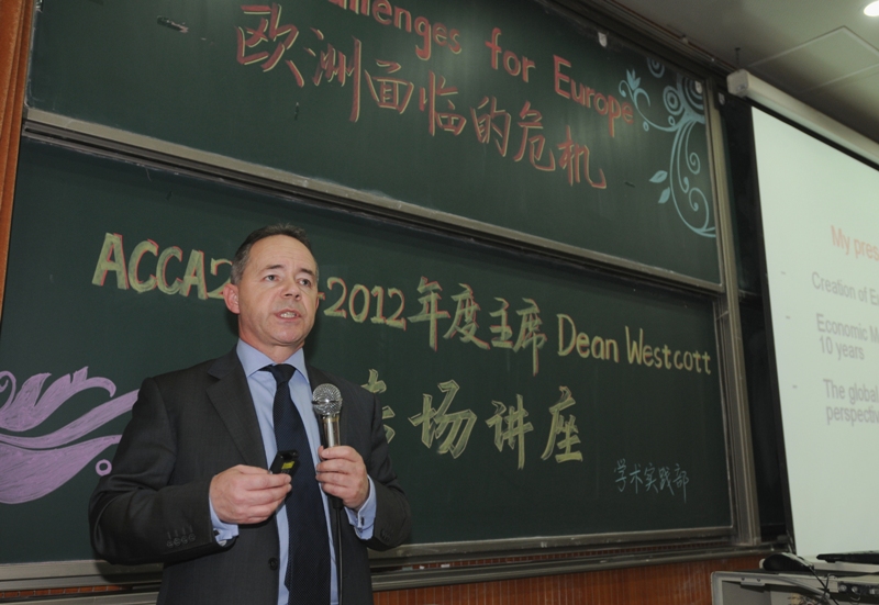 在演讲中Dean Westcott先生从欧盟、欧元的历史,现今的状况及未来发展的趋势,以会计师的角度阐述了欧洲经济危机的形成及未来可能的改变和解决之道,详尽的数据讲解和客观的论述给同学们留下了深刻的印象,并对欧洲所面临的经济困难及给全球带来的影响有了更直观和深刻的认识。他提到了会计及审计工作在公司发展及国家经济增长的过程中所起到的重要作用,并以一个资深accountant的视角为同学们解读了目前欧洲的发展现状,发展模式及遇到的瓶颈。他一方面肯定了欧盟成立的意义和货币统一对整个欧洲的益处,另一方面也犀利地指出了欧盟繁荣过后,欧洲各国面临种种危机。在他看来,产业结构不平衡,人口结构不平衡,刚性的社会福利制度都是危机引发的导火索。而单一货币下不同国家竞争力的差异及欧元区制度的缺陷也是危机产生的重要原因。同时,政府不断削减开支,不断降低民众社会福利制度,也使得民众对国家经济复苏的信心不断降低。