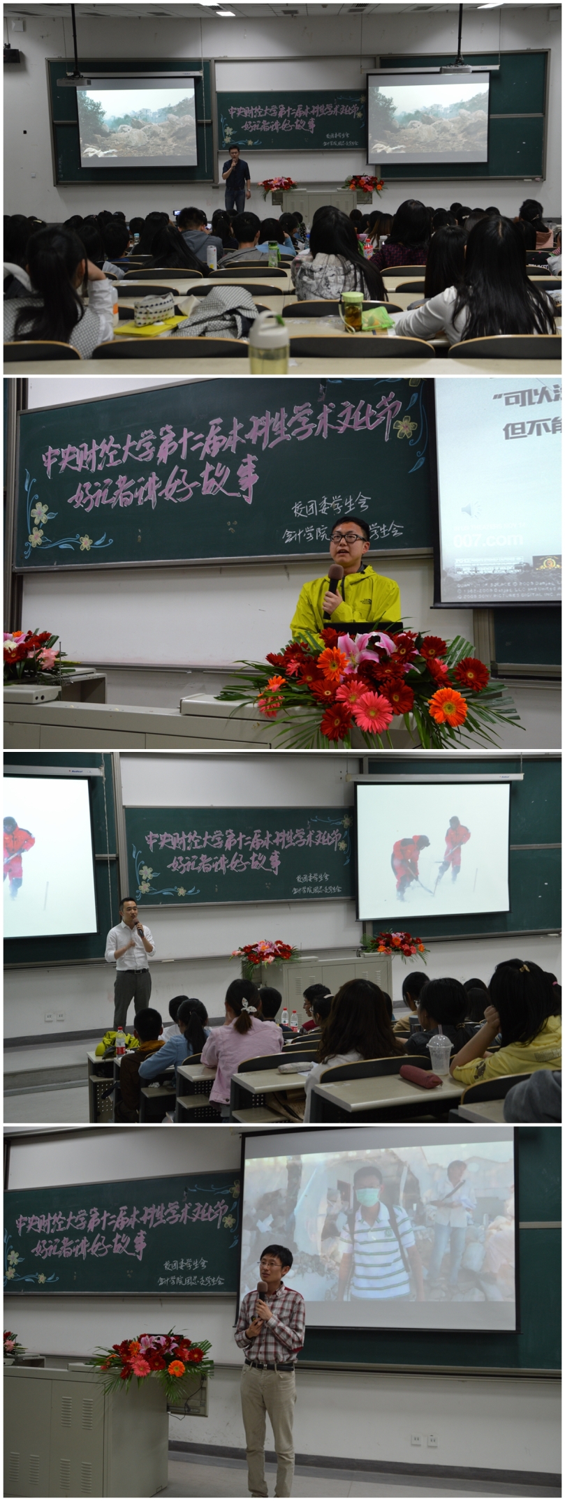 随后,四位记者分别用他们的亲身经历为同学们讲述有温度的新闻、有灵魂的故事。新华社的孙铁翔记者讲述了自己在汶川地震第一时间进入北川向全国观众播报最真实的灾情以及他曾在南海“981”钻井平台的护航任务。中央人民广播电台的吴喆华记者接着讲述为员工实地探访富士康工厂,用出色的演技,多次乔装打扮潜入“敌方”内部,只为将真相告诉每一位观众。中国海洋报社的高悦记者曾随中国南极科考队执行“昆仑站”科考任务,并成功登上了“南极冰盖”的最高点;也曾随中国海警舰队首次巡航钓鱼岛,在太平洋、大西洋、印度洋留下了自己的足迹和新闻报道。人民日报记者焦翔讲述从埃及、利比亚到叙利亚用自己的镜头记录下战争的残酷,战争中人民的真实生活的经历。