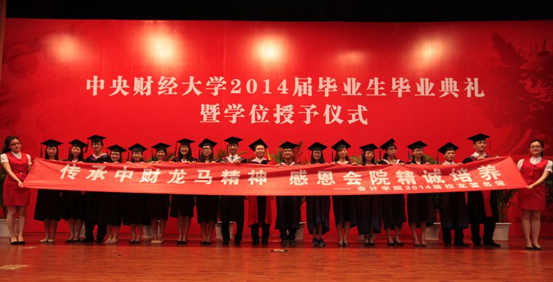 北京市热力集团公司财务总监李心福博士员工和客座导师代表致辞。李心福老师首先表达了他对2014届全体毕业生的祝贺,他回顾了在中财会院的求学岁月,分享了他的职业之路与人生感悟,希望同学们感怀师恩,勿忘母校,继续关心母校的建设,常回来看看。随后进行了新员工接收仪式,17名各班推选出的员工大使,代表2014届全体新员工与李心福老师一同在印有“传承中财龙马精神感恩会院精诚培养”的横幅上签名留念。