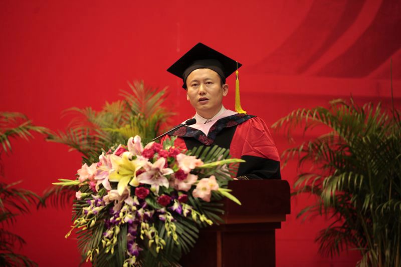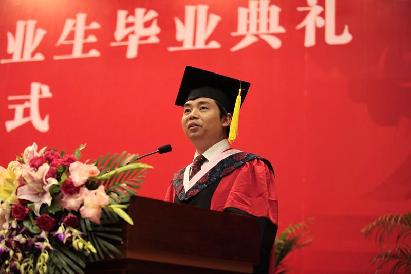 教师代表陈刚发言。他追忆了感人肺腑的师生情谊,并嘱咐每一个毕业生在学好知识和技能的同时提升自己的道德修养,不可孤芳自赏,不可损人利己,力争为国家与社会贡献自己的力量。陈老师的致辞深情中透着幽默,温情中饱含智慧的“陈氏名言”博得全场师生的阵阵掌声。