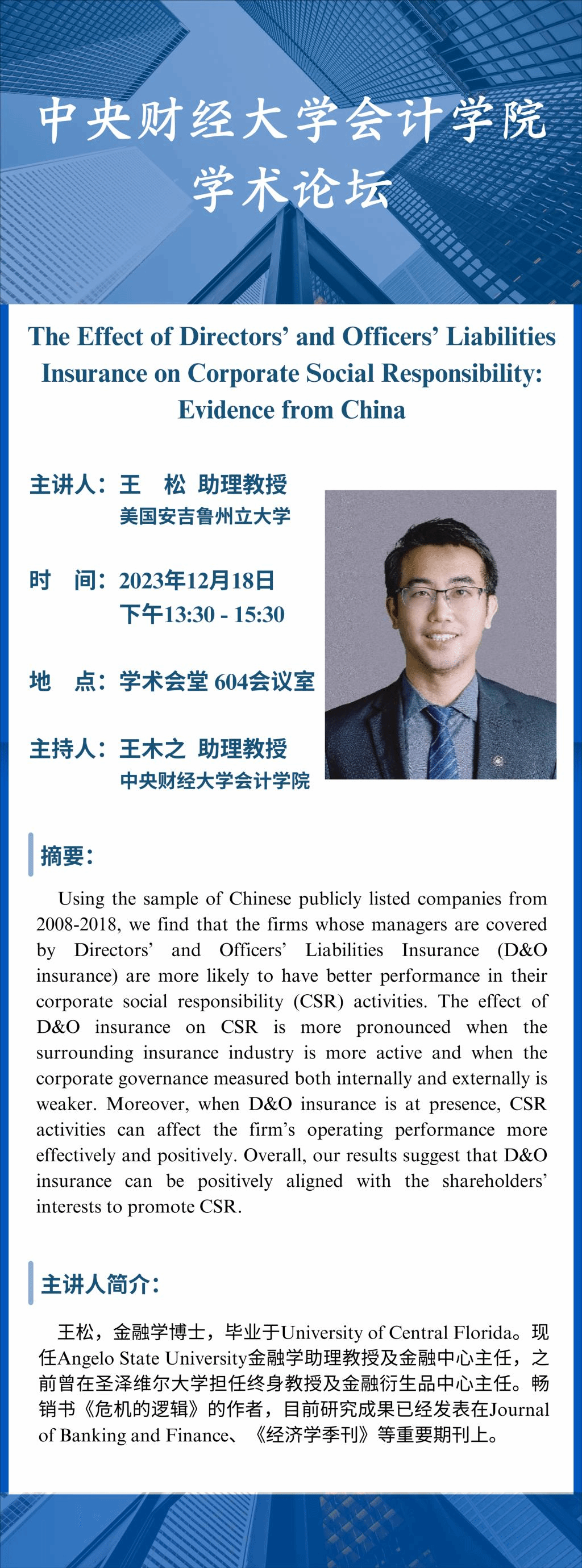 学术论坛|王松:The Effect of Directors’ and Officers’ Liabilities Insurance on Corporate Social Responsibility: Evidence from China