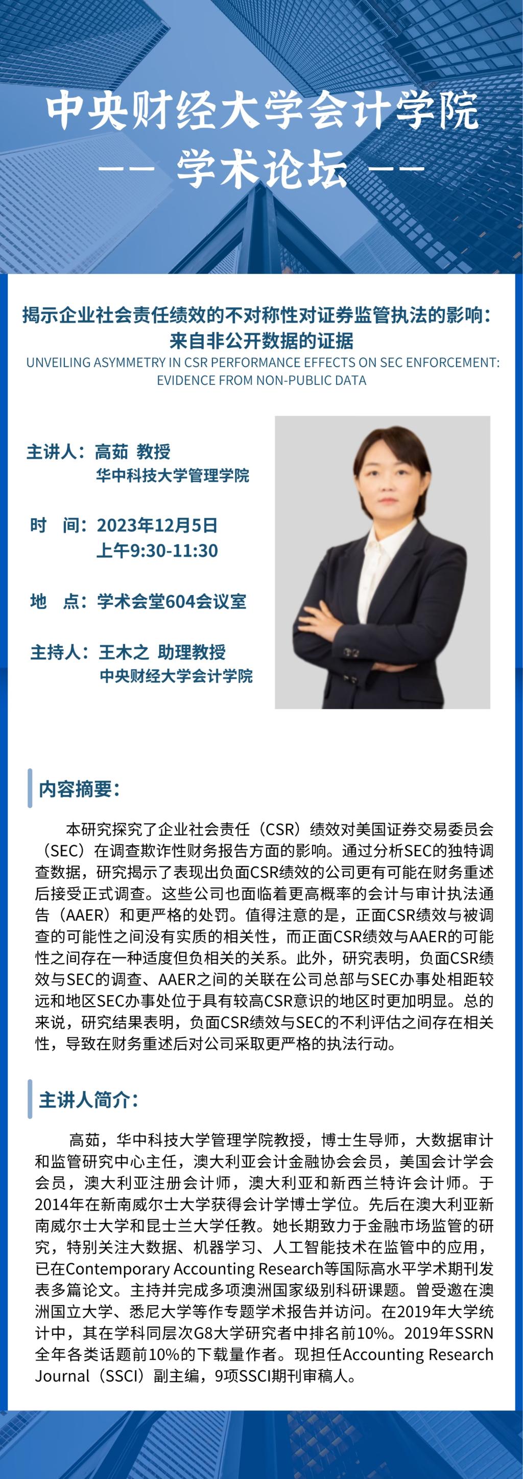 学术论坛|高茹:揭示企业社会责任绩效的不对称性对证券监管执法的影响:来自非公开数据的证据