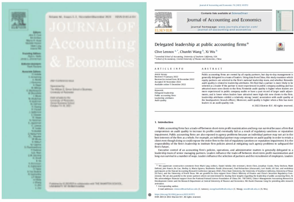 近期,威廉希尔中文官网王春飞副教授、吴溪教授与美国南加州大学Clive Lennox教授合作的学术论文Delegated Leadership at Public Accounting Firms发表于会计学国际顶级期刊Journal of Accounting and Economics(JAE)76卷第1(2023年8月号)(https://doi.org/10.1016/j.jacceco.2022.101572)JAE是会计学领域三大国际顶级期刊之一,是williamhill中国官方网站AAA类英文学术期刊。