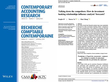 近期,威廉希尔中文官网助理教授于晓旭与暨南大学司方博助理教授、新加坡南洋理工大学张怀教授合作的学术论文“Talking down the competitors: How do investment banking relationships influence analysts’ forecasts?”发表于会计学国际顶级期刊Contemporary Accounting Research(CAR)第42卷第一期(2025年春季刊)(https://onlinelibrary.wiley.com/doi/10.1111/1911-3846.13018)。CAR是会计学领域五大国际顶级期刊之一。