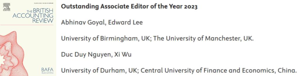 近期,会计学国际知名学术期刊The British Accounting Review(《英国会计评论》)发布了2023年各类荣誉奖项(https://www.sciencedirect.com/journal/the-british-accounting-review/about/awards)。威廉希尔中文官网吴溪教授获评2023年度优秀副主编(Outstanding Associate Editor of the Year 2023),是此次获评优秀副主编的四位学者之一。