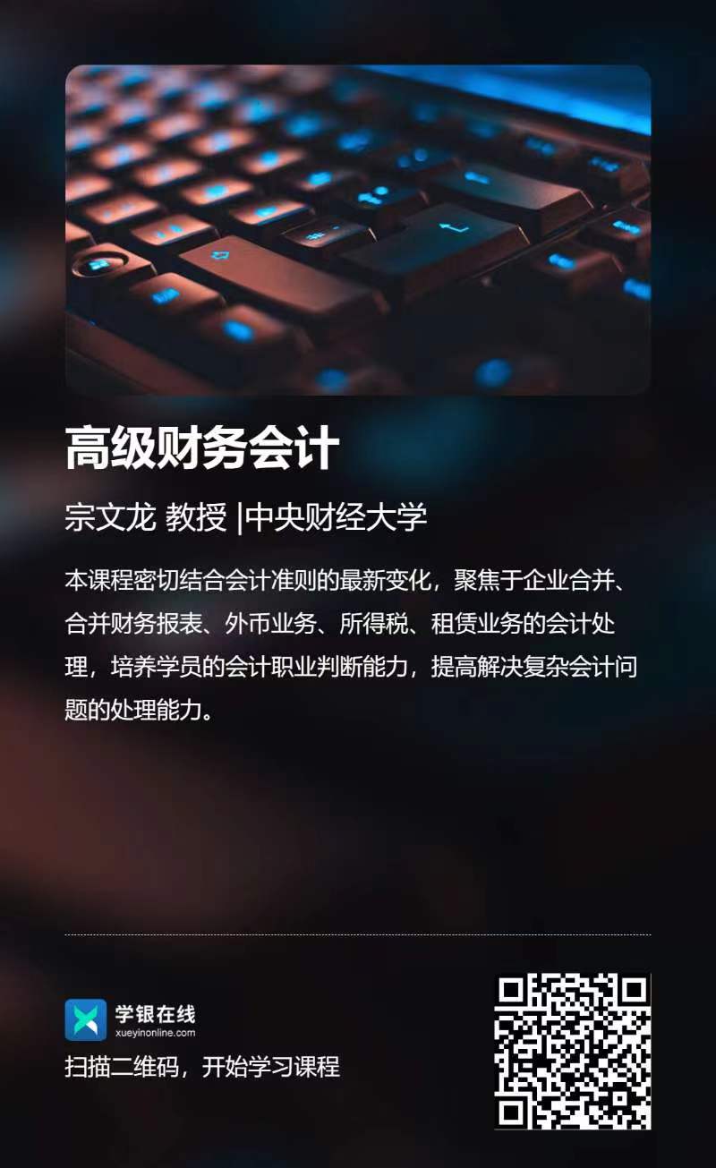 《高级财务会计》课程是会计学专业的核心主干课程之一,课程内容紧密结合当前社会发展,特别是上市公司的会计核算,主要讲解企业合并、合并财务报表、外币业务、所得税会计、租赁会计等特殊业务的会计确认、计量和报告。本课程适合会计学、财务管理学专业本科学习,也适合企业会计人员的后续教育,以及准备参加中、高级会计专业技术资格考试和注册会计师执业资格考试的学员。通过学习本课程学习,帮助学员理解会计准则的底层逻辑,熟练掌握近年来我国会计准则改革的难点和热点问题,提高会计实务的处理能力。